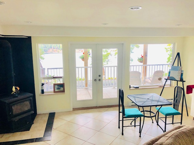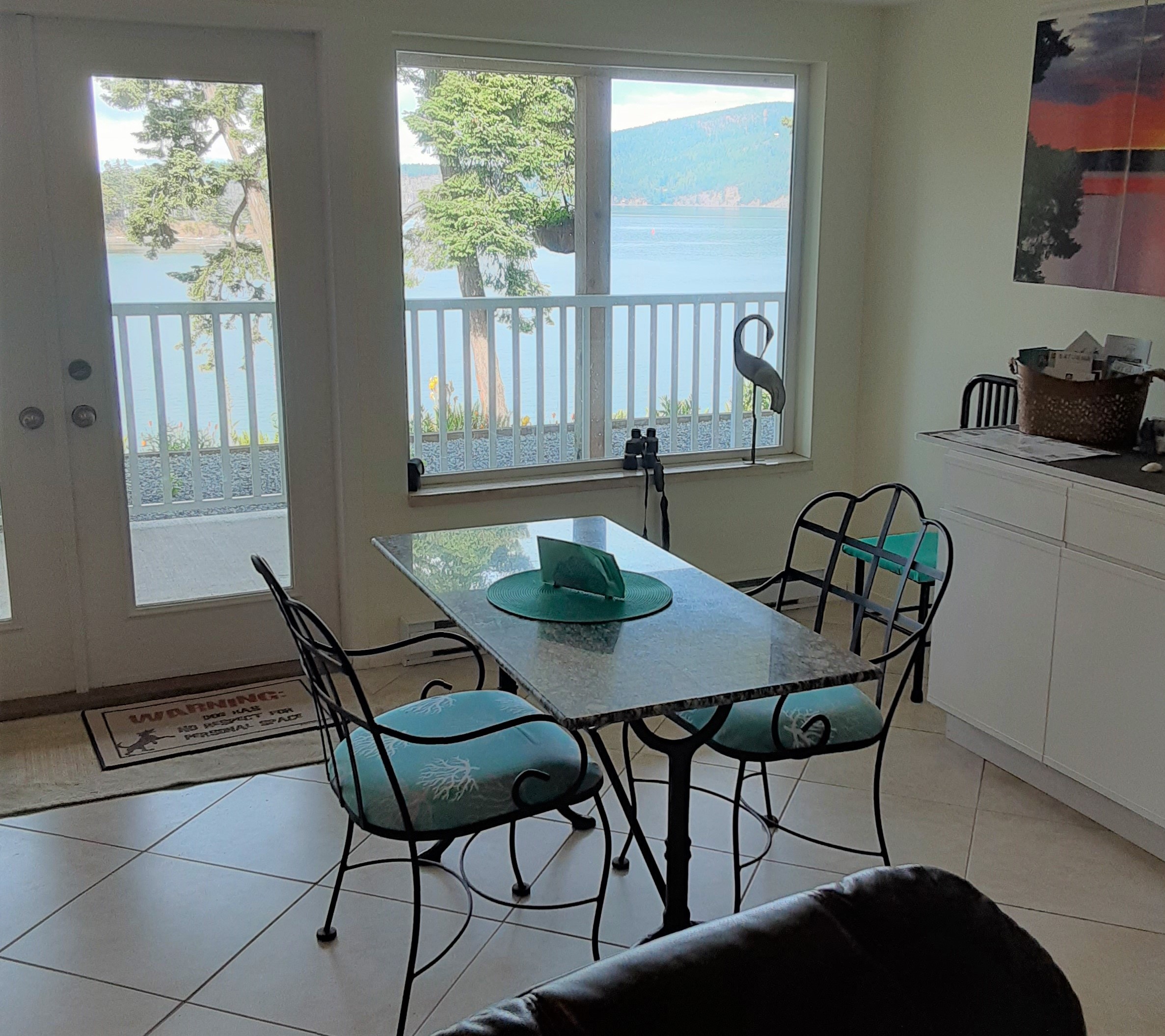 Our B & B is one fenced acre on the ocean. The owner is an avid gardener so if artistic endeavours are your interest, there are usually lots of colourful flowers to draw or paint. The gardens and ocean landscapes are inspiring. We often watch sailboats, kayakers, Otters, Blue Herons, Eagles and Osprey from the deck which stretches 60 ft across the front of the home. A BBQ grill is located on this deck along with a glass patio table, and a few comfortable chairs for relaxing, reading, or eating outdoors. There is a separate driveway for B & B clients with room to park 2 vehicles. A walk down outside stairs to the lower deck, takes you to private entrances to the waterfront bedroom or the Common room. In the Common room, there are limited cooking facilities for those interested in economy for their Pender Island visit. There is a large screen TV, easy chairs, microwave, toaster, griddle, coffee pot, electric tea kettle, refrigerator, dishes, cutlery, and cookware. Bringing your own food is the most economic way to experience The Penders. We are located about equal distance between the Driftwood Shopping Centre, Browning Harbour Bar and Restaurant, and the more prestigious Poet's Cove Resort. There are pools at both establishments. The Driftwood Centre has a Pharmacy, Jo's Place Restaurant ( REALLY good food for reasonable prices), Liquor Store, Island Savings Bank, Book store, Clothing store, Post Office and Grocery store. There are ATM machines located in the Gas Station Store, the True Value Grocery Store, and the Pharmacy. We are less than a kilometre from Mortimer Spit which has public access to the beach. Boats and kayaks can be launched there easily. There are about 40 ocean access trails on North and South Pender Island. The home is located between the 2 entrances to the Beaumont Hiking Trails. Both are within walking distance, if you are a hiker. These trails are free, safe and easily accessed. Since Pender Island doesn't have bears or cougars, walking is fun and safe anywhere. Cyclists often come to Pender to enjoy our scenery and mountain roads. You may meet some of our numerous deer on the road or trails. Evening is the best time to count deer. Birders will enjoy our huge variety of songbirds and water birds. Bring your binoculars and cameras. Our fenced yard is large enough to accommodate storing your bicycles, motor bikes or kayaks safely for the night. |