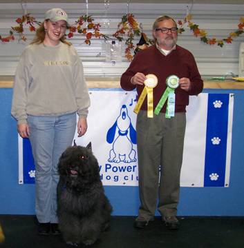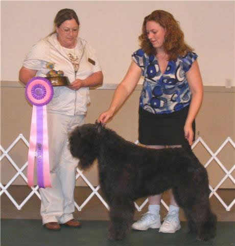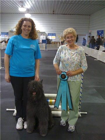 Echo's Accomplishments Born November 23, 2003 Thank you Reserve Best in Show on August 8, 2008 at the CKC ~ Canadian Kennel Club AKC ~ American Kennel Club RN : Rally Novice RA : Rally Advanced CD: Companion Dog Echo has 4 points towards her AKC Championship. Obedience ~ Hign in Trial In 2005, Echo was ranked # 5 Bouvier in the UKC Top Ten. UKC Reserve Best in Show at Trail Creek Dog Training Club in August 2007. UAGII : United Agility Level 2 UACH : United Agility Champion UACHX : United Agility Champion Excellent UGRACH: United Grand Agility Champion 2008 Agility # 41 UKC Agility Level 3 # 47 UKC Agility Level 2 Conformation # 10 Bouvier in UKC Top Ten 2008 2007 Agility # 33 UKC Agility 2 All Star 2007 Conformation # 5 Bouvier in UKC Top Ten 2007 Echo loves agility! Echo started her Agiltiy Career at the UKC Premier in June 2007. In four trials that weekend, she earned her UAG1 title with three Qualifying Scores of 200, 189 and 196; ( A perfect score is 200) she also earned her first qualifying score towards her UAG2 title. On August 19th, 2007, she finished her AG2 title at a Trail Creek Agiltiy Trial with scores of 197 and 192. Since Echo earned her first two titles with ease, Lee Ann decided to start working towards the UKC Agiltiy Championship title. This title can be difficult to obtain. Title is earned by: (A) accumulation of 100 points awarded for scores of 196 or more in the Agility 1 and Agility 2 Classes (at least 40 of the 100 required points must be obtained from the Agility 2 Class). The following schedule is used in the awarding of U-ACH points: The easiest way to earn a UACH is with 10 perfect scores... In two weekends of shows... Now Echo is working on her UACHX ~ Agility Champion Excellent ! She earned 2 qualifying qcores towards this title at Paw Powers in November 2007! She earned a third qualifying score at Smack-Dab's UKC Agility Trial on Dec 29th , 2007. Then she also earned her forth qualifying score