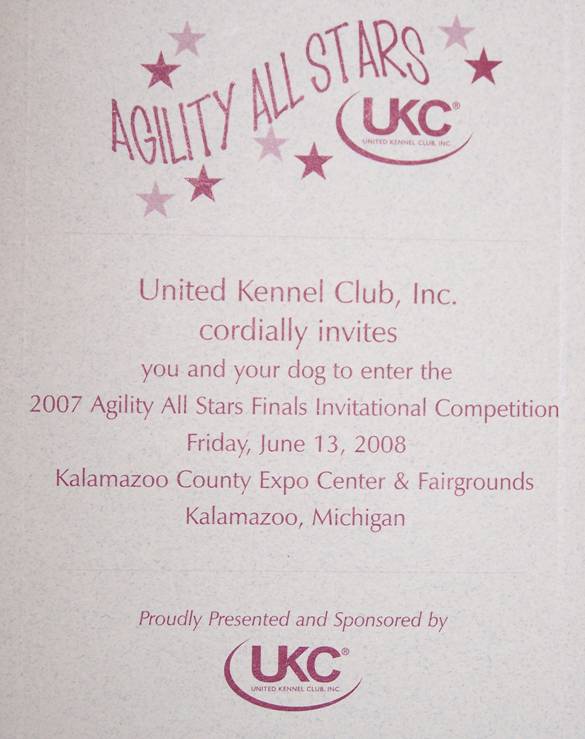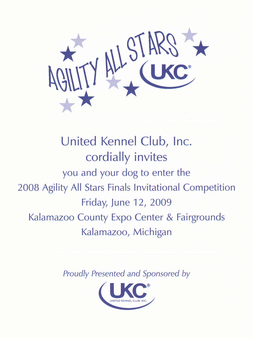 back at Paw Powers on February 16th, 2008. In AG3, there is a greater level of difficulty because there are several obstacles (Table, Pause Box and Weave Poles) in which the handler must be 6 feet away from.... essentially you must send the dog away from you to perform the obstacle on their own. ECHO was ranked #33 out of the TOP 50 All-Breed UKC Agility in 2007. Echo working towards her UACHX You must earn 5 Qualifying Scores Echo finished her UGRACH Thank you Judge Diane Vlasak November 15, 2008 To earn a UGRACH a dog must: Echo, of course,