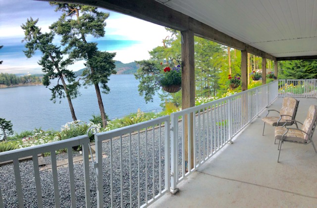 Our B & B is one fenced acre on the ocean. The owner is an avid gardener so if artistic endeavours are your interest, there are usually lots of colourful flowers to draw or paint. The gardens and ocean landscapes are inspiring. We often watch sailboats, kayakers, Otters, Blue Herons, Eagles and Osprey from the deck which stretches 60 ft across the front of the home. A BBQ grill is located on this deck along with a glass patio table, and a few comfortable chairs for relaxing, reading, or eating outdoors. There is a separate driveway for B & B clients with room to park 2 vehicles. A walk down outside stairs to the lower deck, takes you to private entrances to the waterfront bedroom or the Common room. In the Common room, there are limited cooking facilities for those interested in economy for their Pender Island visit. There is a large screen TV, easy chairs, microwave, toaster, griddle, coffee pot, electric tea kettle, refrigerator, dishes, cutlery, and cookware. Bringing your own food is the most economic way to experience The Penders. We are located about equal distance between the Driftwood Shopping Centre, Browning Harbour Bar and Restaurant, and the more prestigious Poet's Cove Resort. There are pools at both establishments. The Driftwood Centre has a Pharmacy, Jo's Place Restaurant ( REALLY good food for reasonable prices), Liquor Store, Island Savings Bank, Book store, Clothing store, Post Office and Grocery store. There are ATM machines located in the Gas Station Store, the True Value Grocery Store, and the Pharmacy. We are less than a kilometre from Mortimer Spit which has public access to the beach. Boats and kayaks can be launched there easily. There are about 40 ocean access trails on North and South Pender Island. The home is located between the 2 entrances to the Beaumont Hiking Trails. Both are within walking distance, if you are a hiker. These trails are free, safe and easily accessed. Since Pender Island doesn't have bears or cougars, walking is fun and safe anywhere. Cyclists often come to Pender to enjoy our scenery and mountain roads. You may meet some of our numerous deer on the road or trails. Evening is the best time to count deer. Birders will enjoy our huge variety of songbirds and water birds. Bring your binoculars and cameras. Our fenced yard is large enough to accommodate storing your bicycles, motor bikes or kayaks safely for the night. |